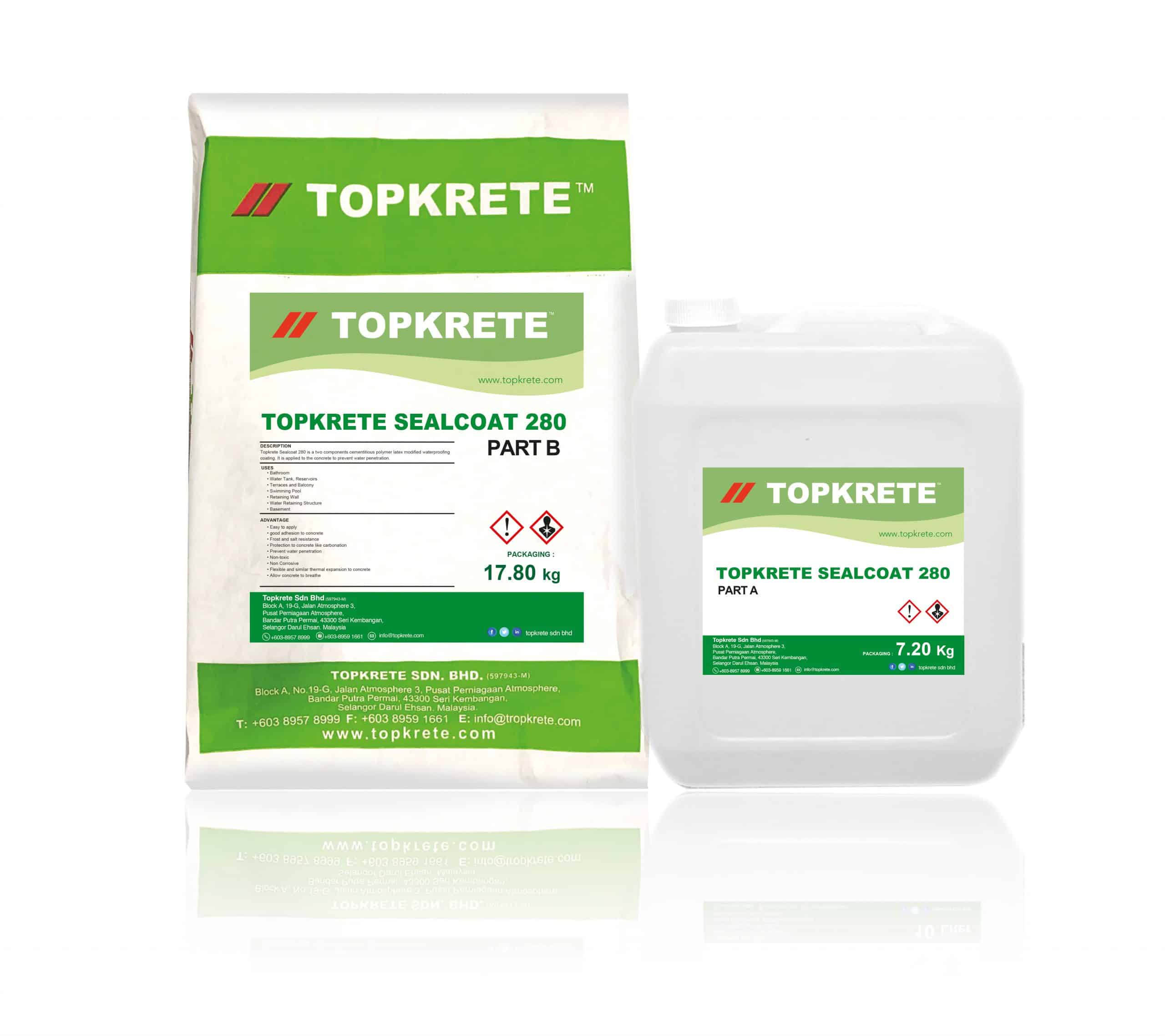 Topkrete Sealcoat 280 is a two components cementitious polymer latex modified waterproofing coating. It is applied to the concrete to prevent water penetration.